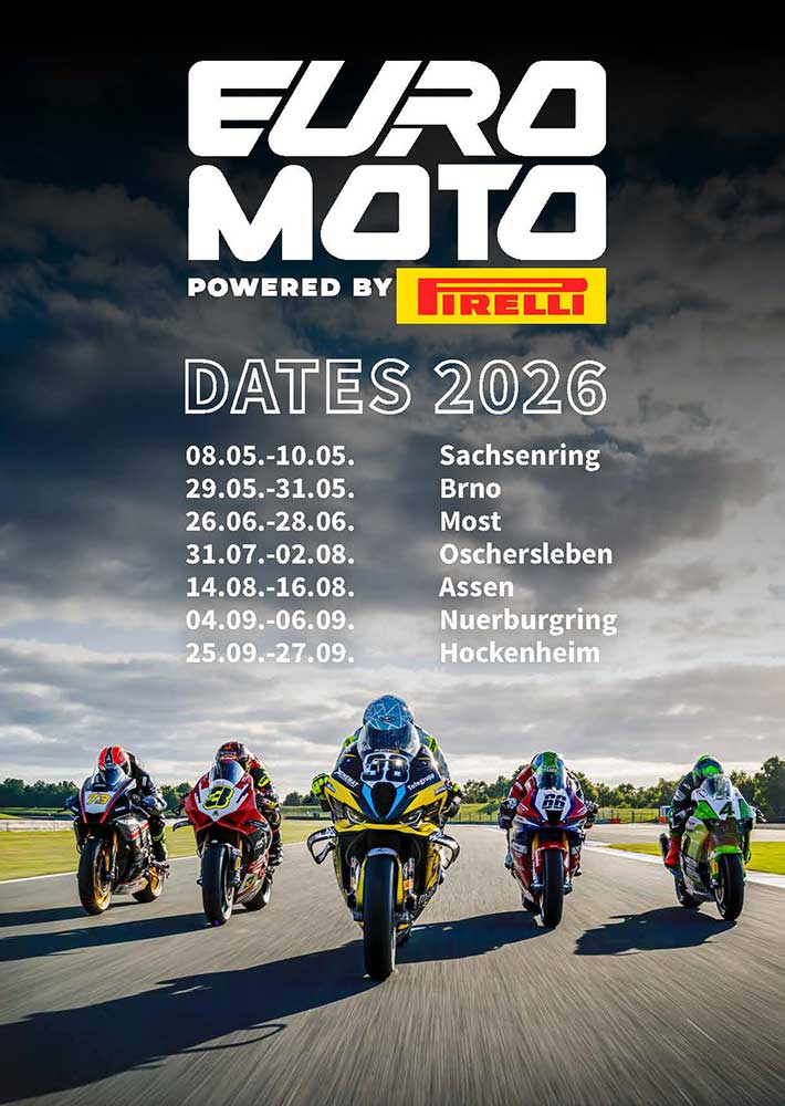 Der Kalender für die EURO MOTO und die parallel stattfindende IDM umfasst 2026 sieben Rennwochenenden – mit bewährten Austragungsorten wie dem Sachsenring, Oschersleben, Assen (NL), Most (CZ), Nürburgring und Hockenheimring. Neu hinzu kommt die traditionsreiche WM-Strecke im tschechischen Brünn (Brno). Nicht mehr Teil der Serie ist das Schleizer Dreieck: Die Naturrennstrecke verfügt derzeit über keine internationale FIM-Homologation. Das Reglement der Superbike-Klasse bleibt im Wesentlichen erhalten, bekommt aber punktuelle Feinschliffe. Die Klassen Supersport und Sportbike orientieren sich künftig am WM-Reglement.